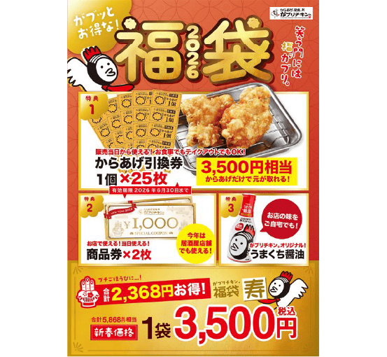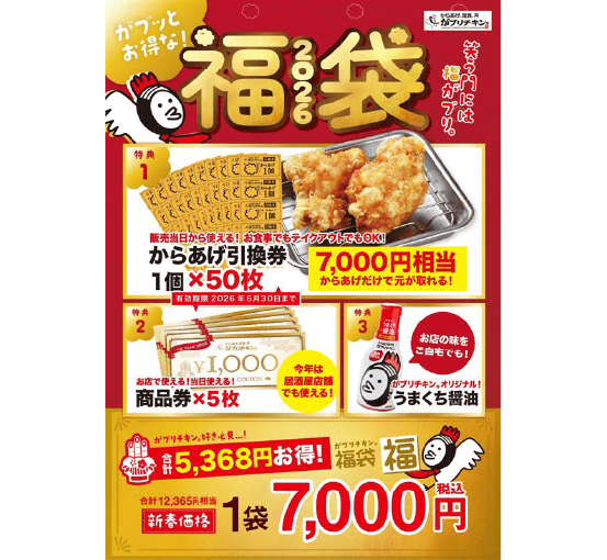 からあげ引換券(25枚)、商品券1,000円(2枚)、 オリジナルうまくち醤油(1本)入り。