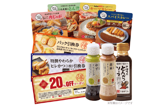 ドレッシング・醤油類・ふりかけ・菓子など7点以上2,300円(税込)以上の品が入っています。